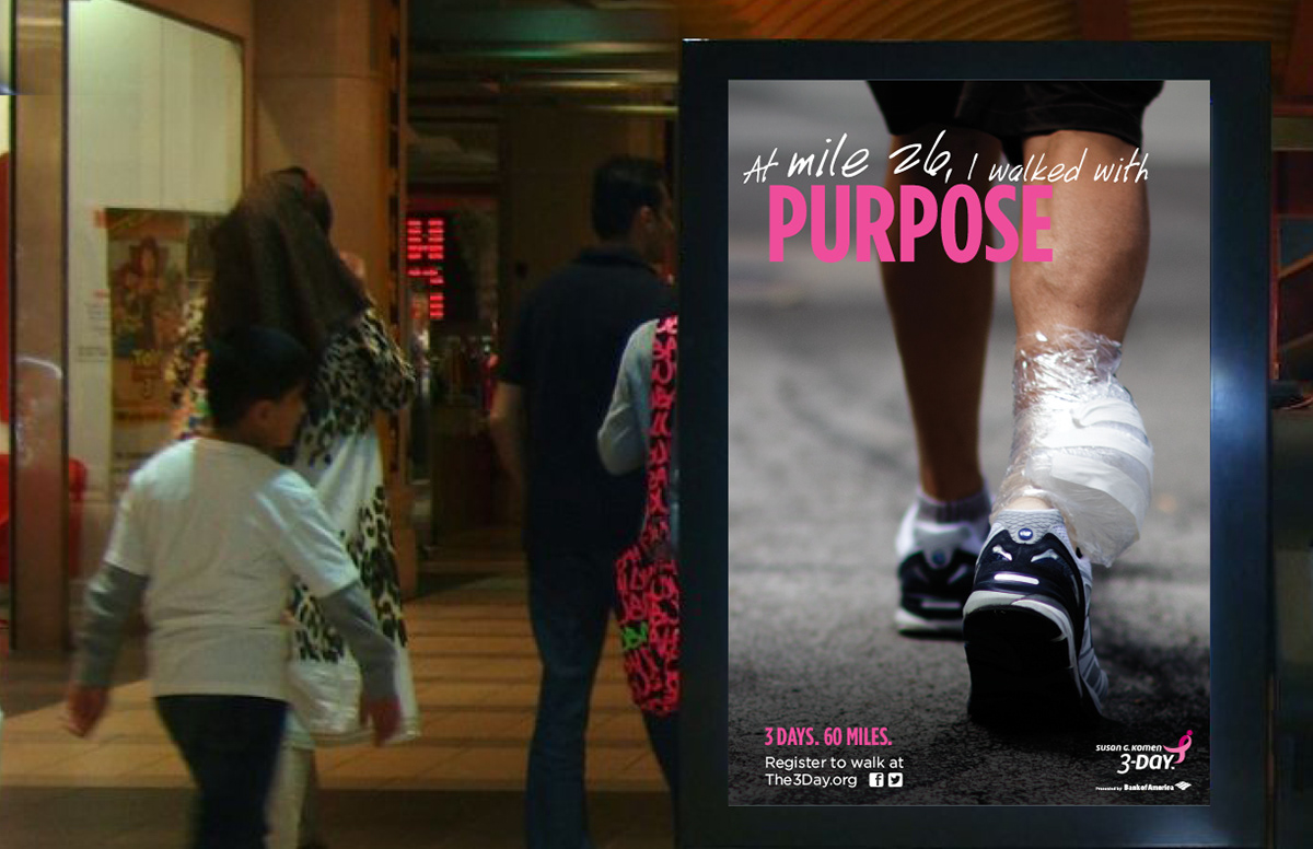 Our TV spot features a new walker at the beginning of her walk. As she is tying her shoes before she heads off, she imagines what walking 60 miles would be like, how hard it would be. Some miles bring a revelation, some a memory, but each mile along the route reminds her why she’s there—to take one step closer to a world without breast cancer.